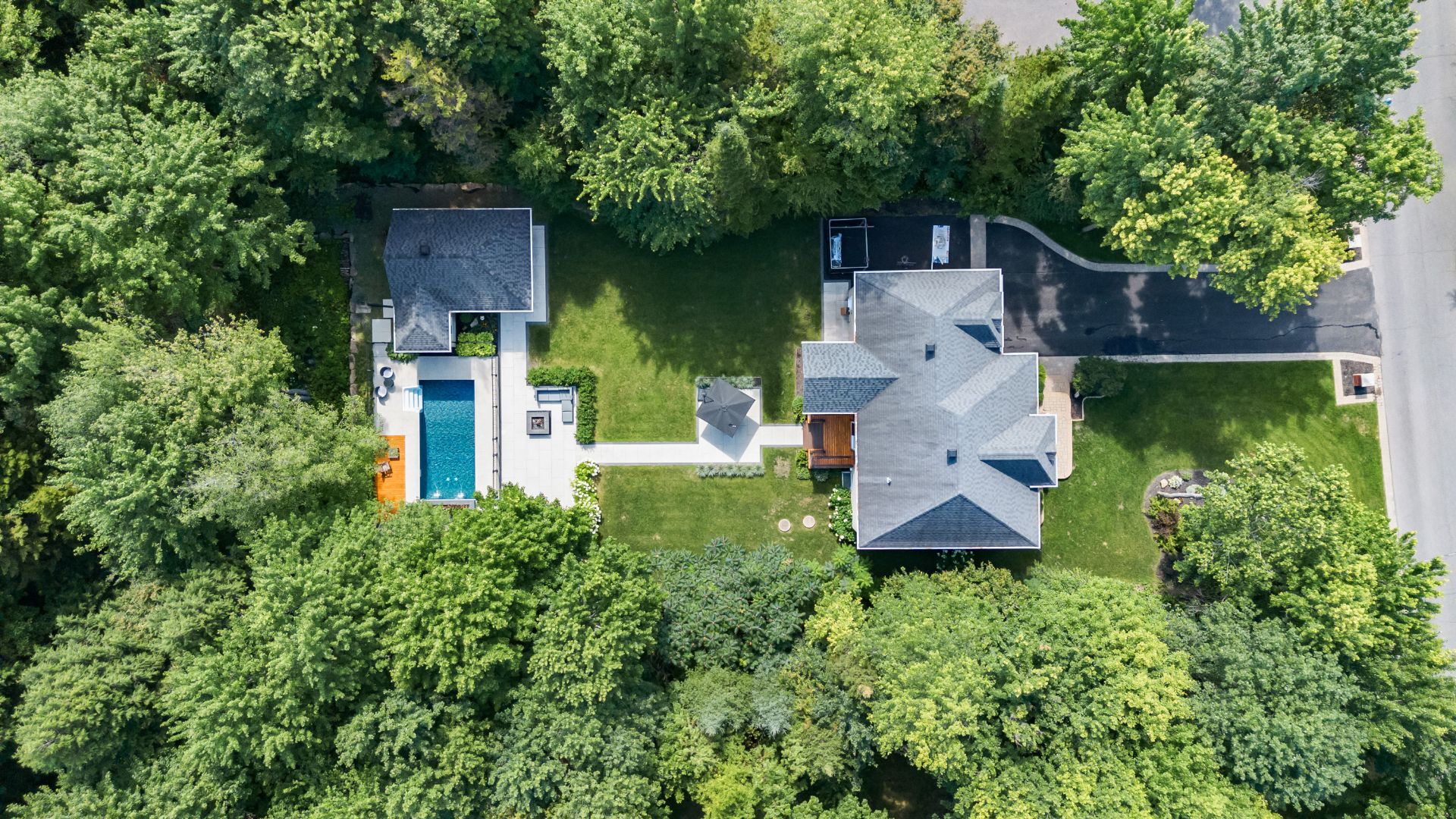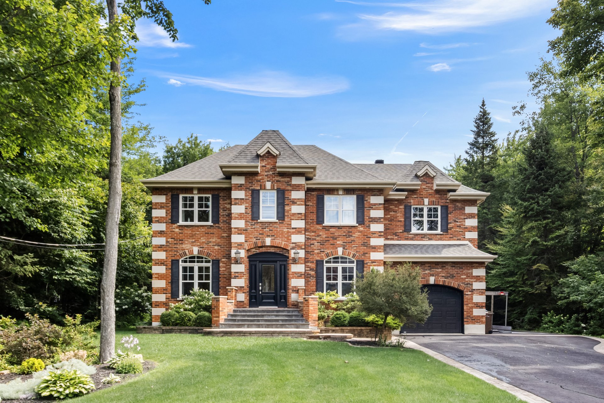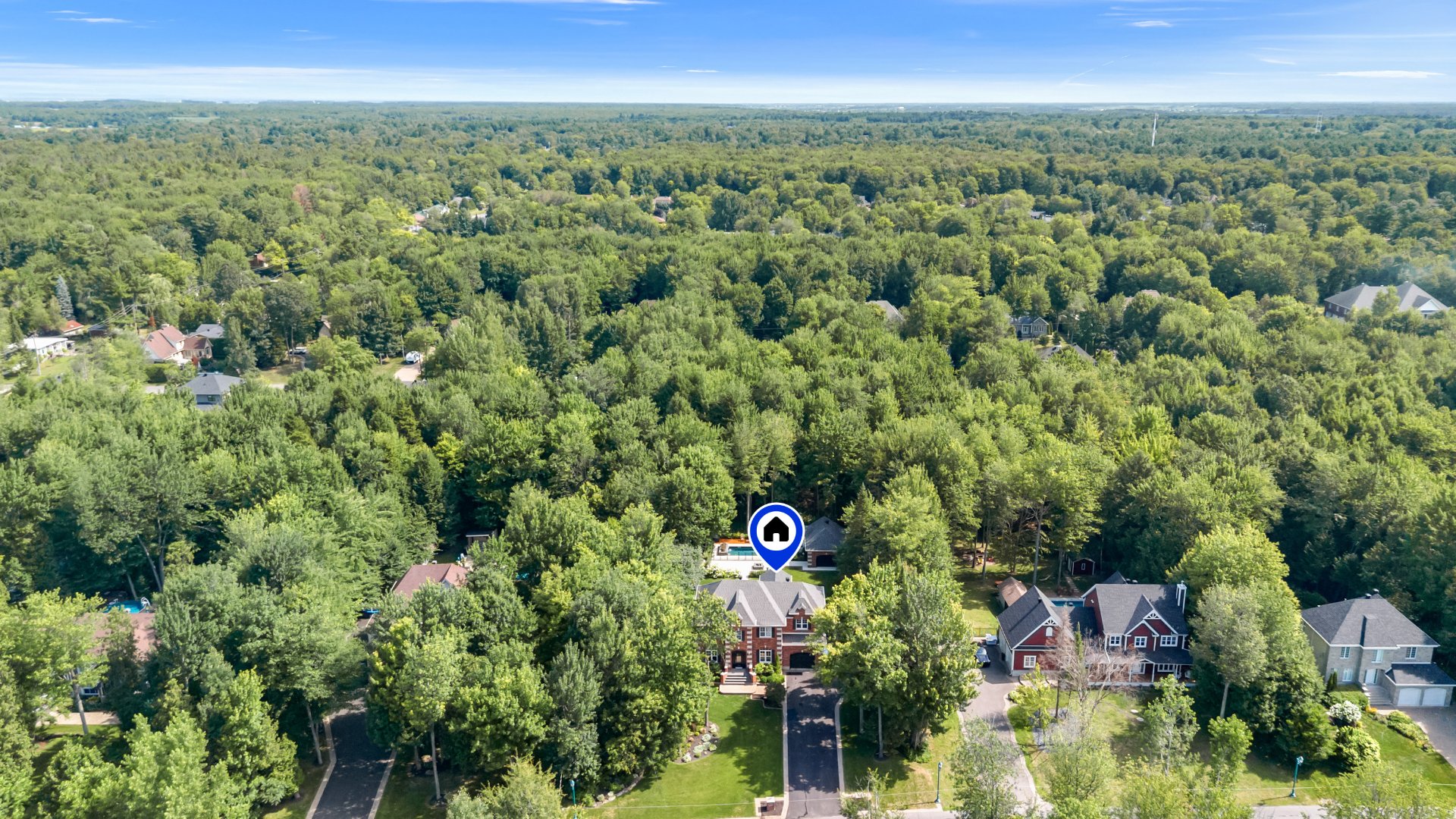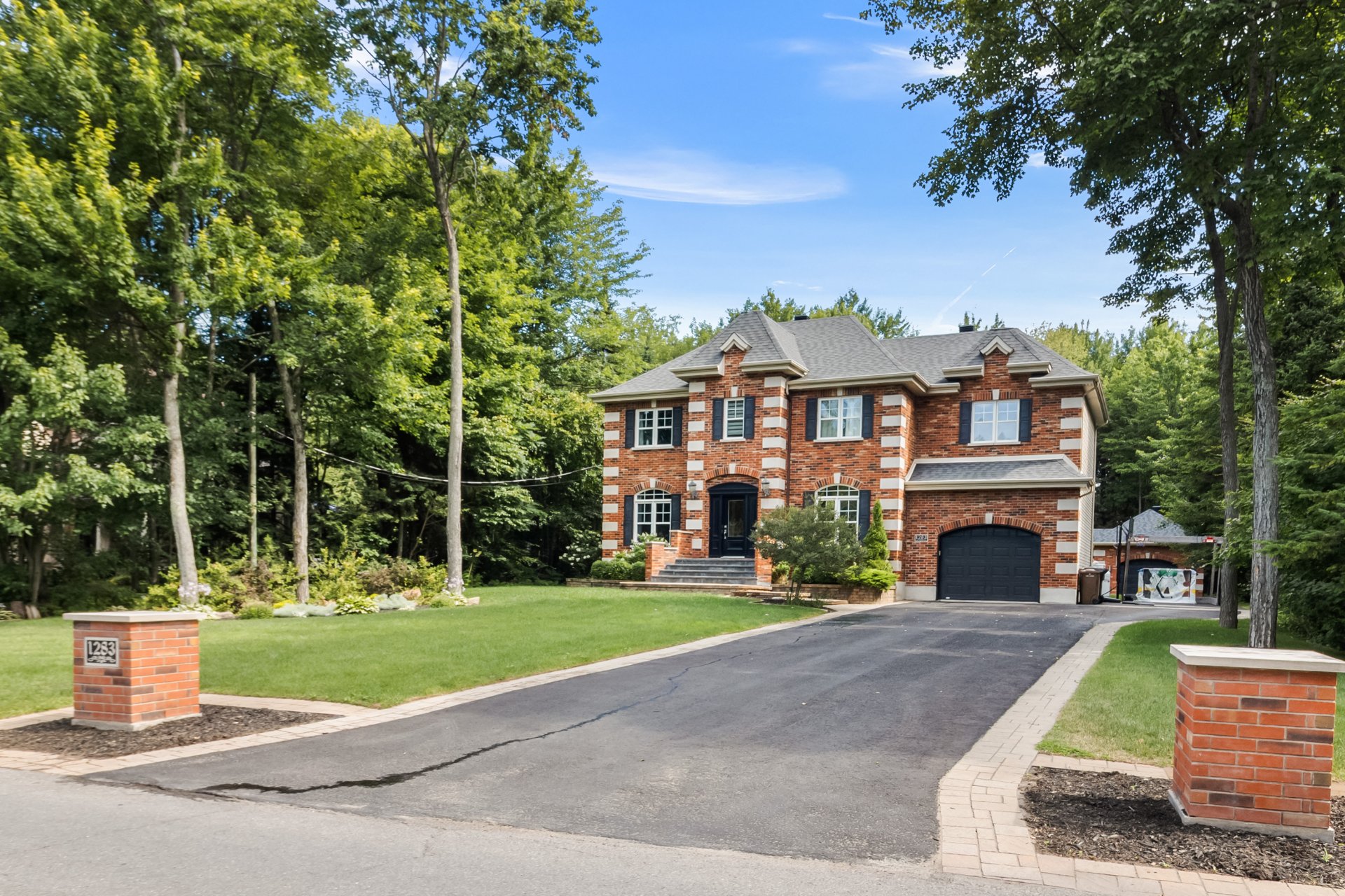 This exceptional two-storey residence offers spacious, light-filled living areas and an elegant kitchen designed for entertaining. The primary suite features a walk-in closet, ensuite bathroom, and covered balcony, while three additional bedrooms, a second bathroom, and a laundry room complete the upper level. The finished basement includes a family room, games room, gym, and more. Outside, enjoy a beautifully landscaped backyard with an outdoor kitchen and in-ground pool. All set on a stunning wooded lot of over 34,000 sq. ft., offering privacy and an exceptional lifestyle surrounded by nature.