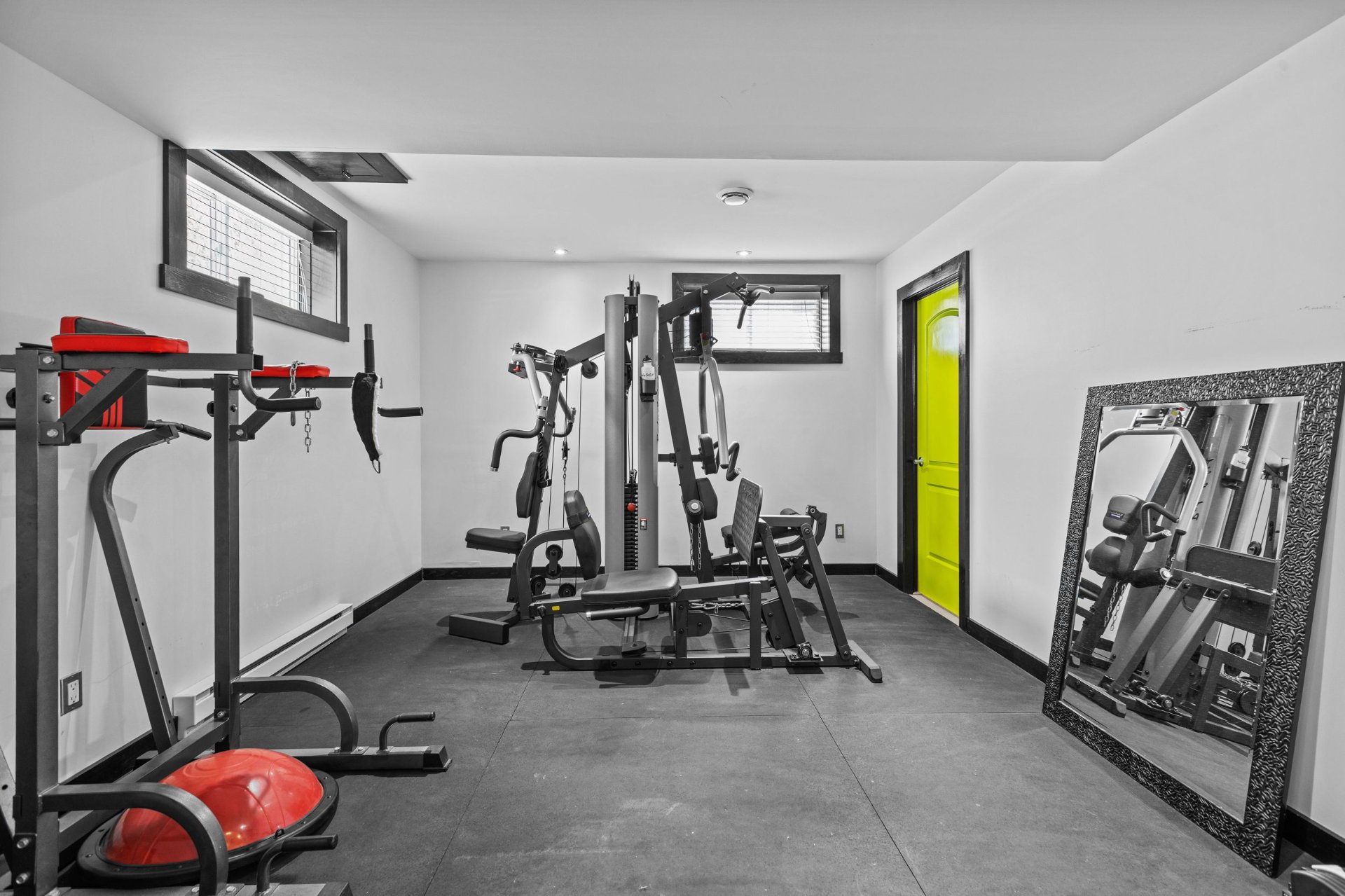 - Gym in the basement with an attached powder room that