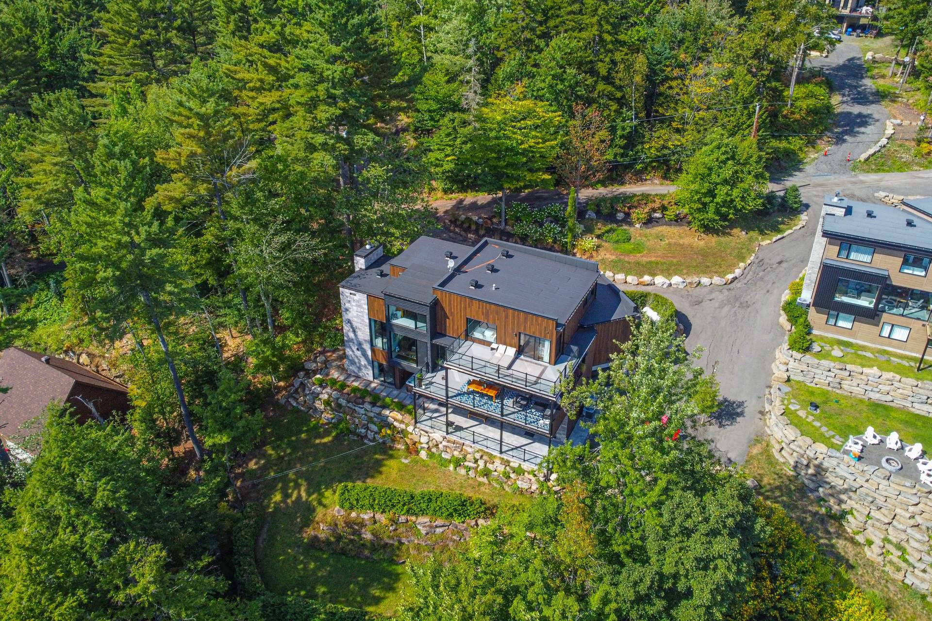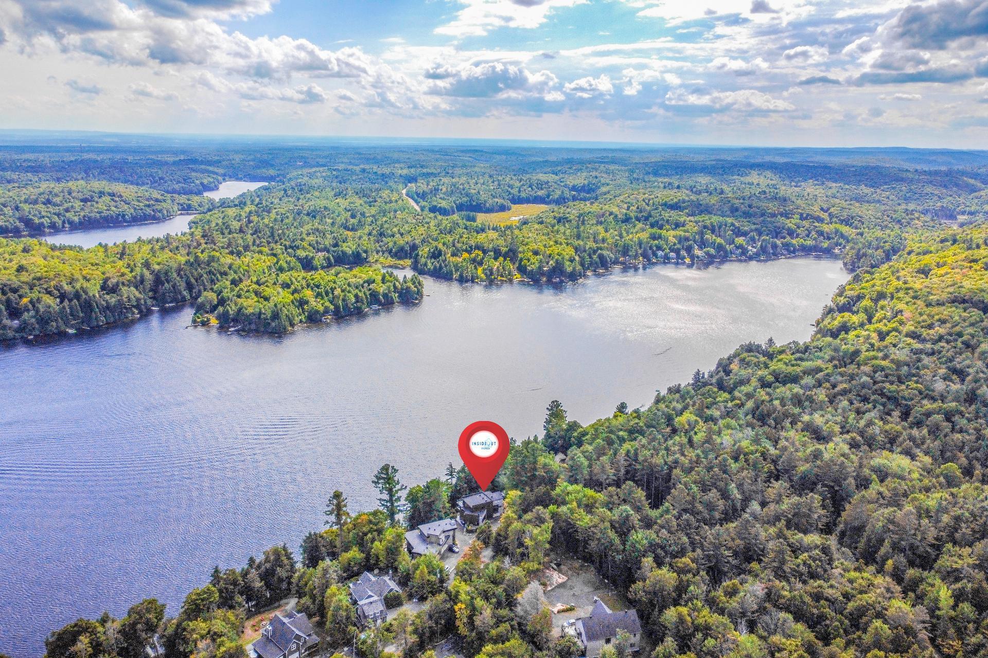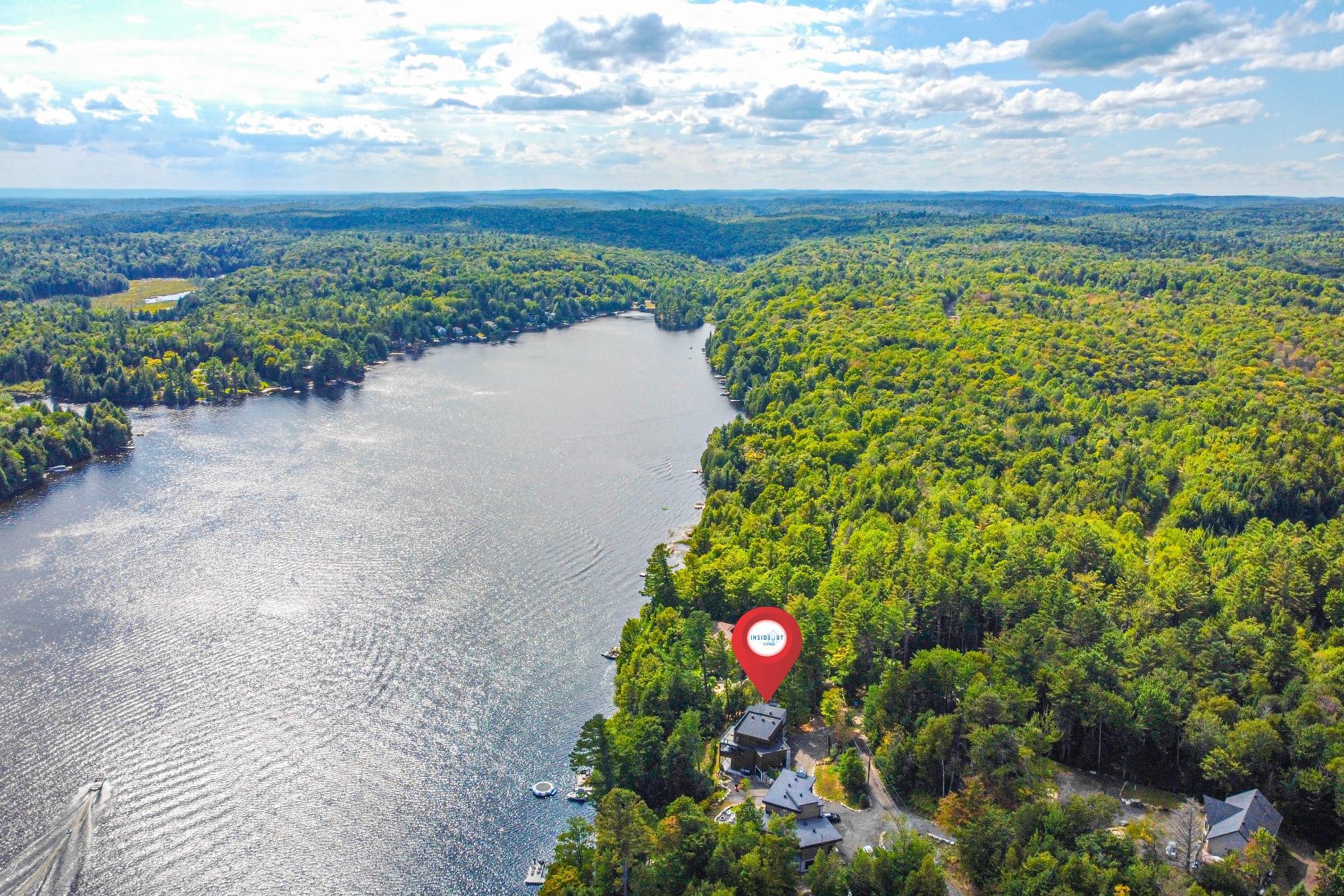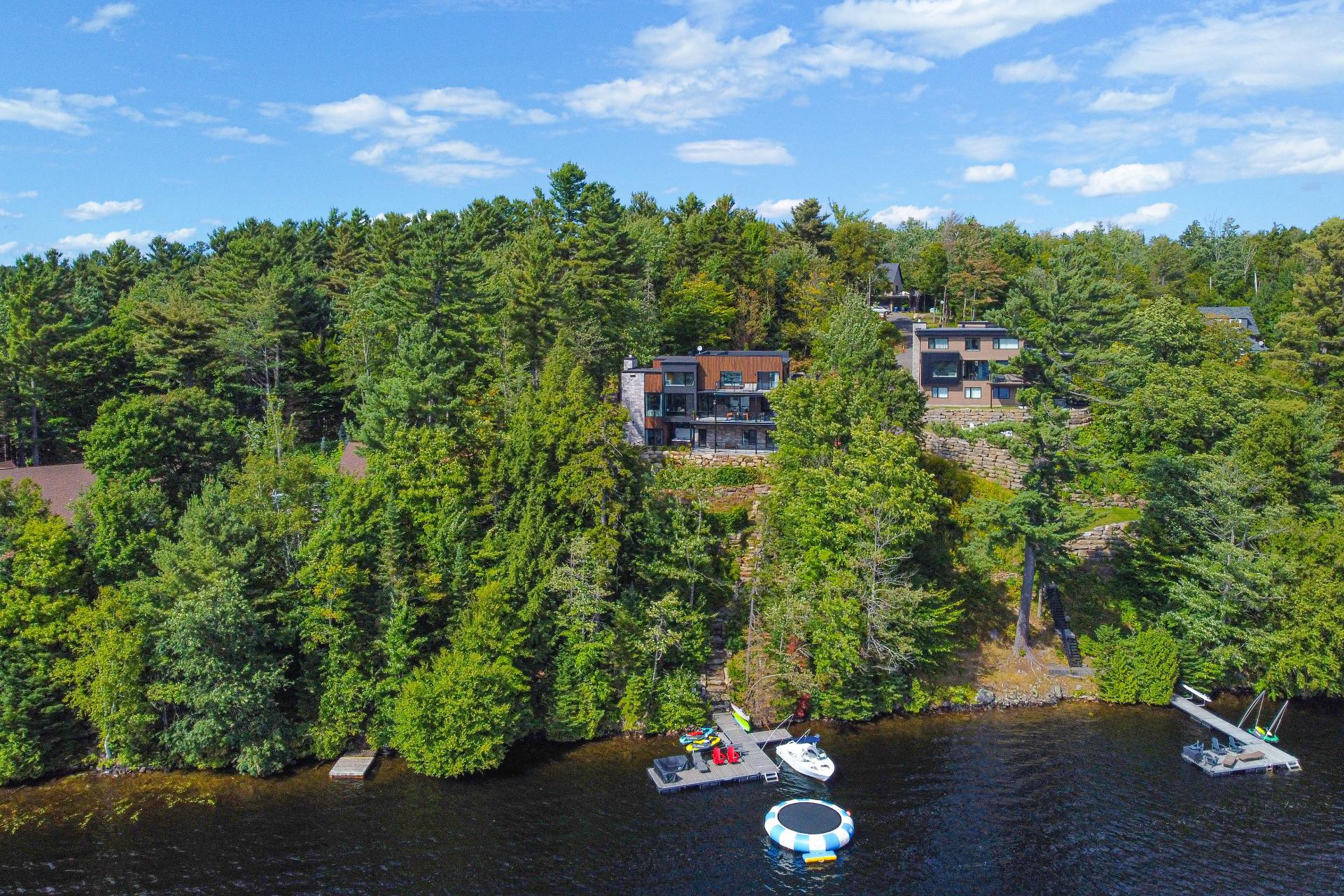 Exclusive custom-built property (2019) on Lake Barron. Offers spectacular views and easy access to the private dock. A contemporary, magazine-worthy home. The main floor is flooded with natural light, featuring 10-ft ceilings and heated concrete floors (glycol). Stunning kitchen with high-end appliances, quartz, and walk-in pantry. Spacious family room with Stuv wood fireplace; glass office (12×12) on two levels and a huge covered terrace. Garden-level basement includes 2 bedrooms, a dorm, gym, family room, and bathroom. Located 12 minutes from all services in Morin Heights.