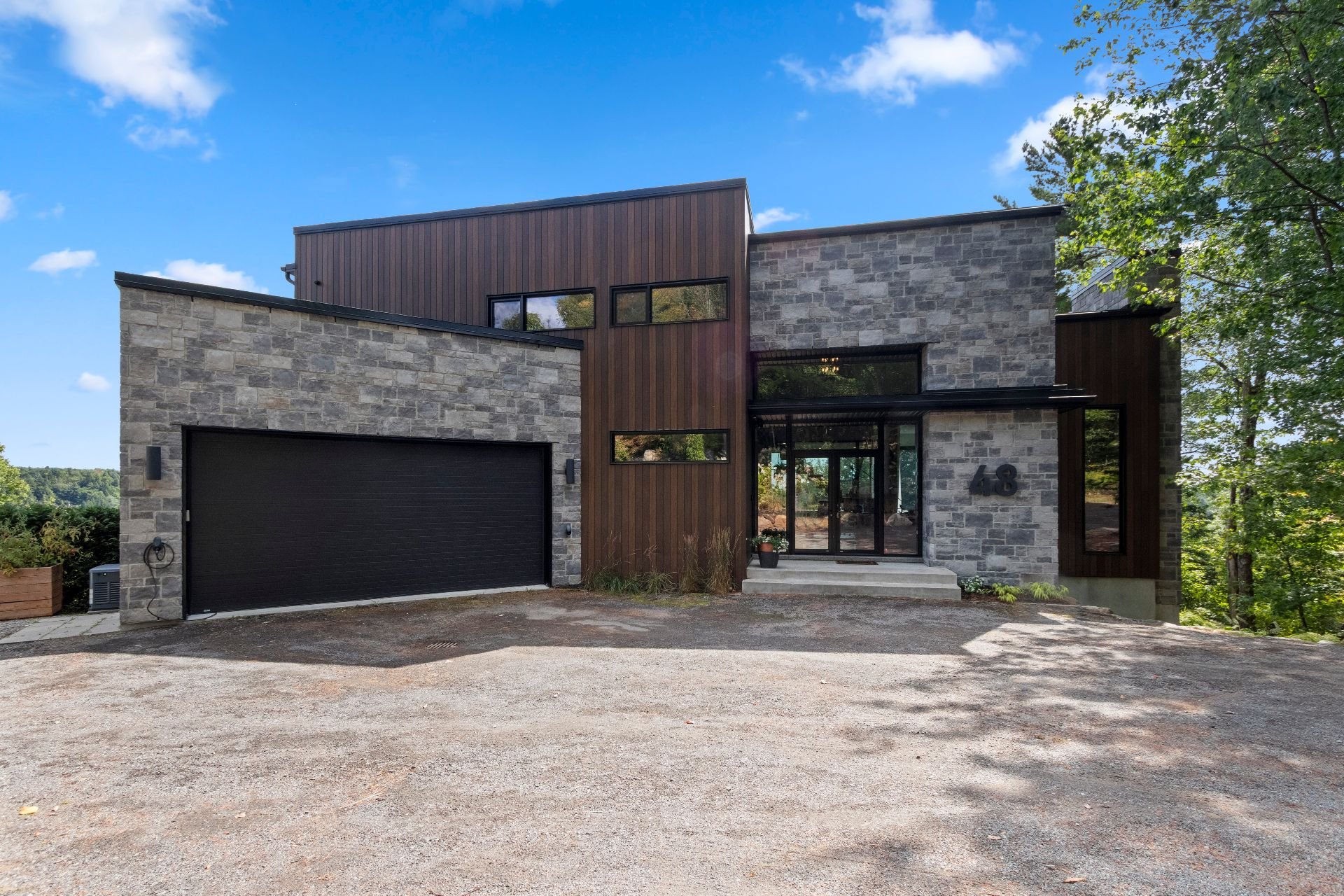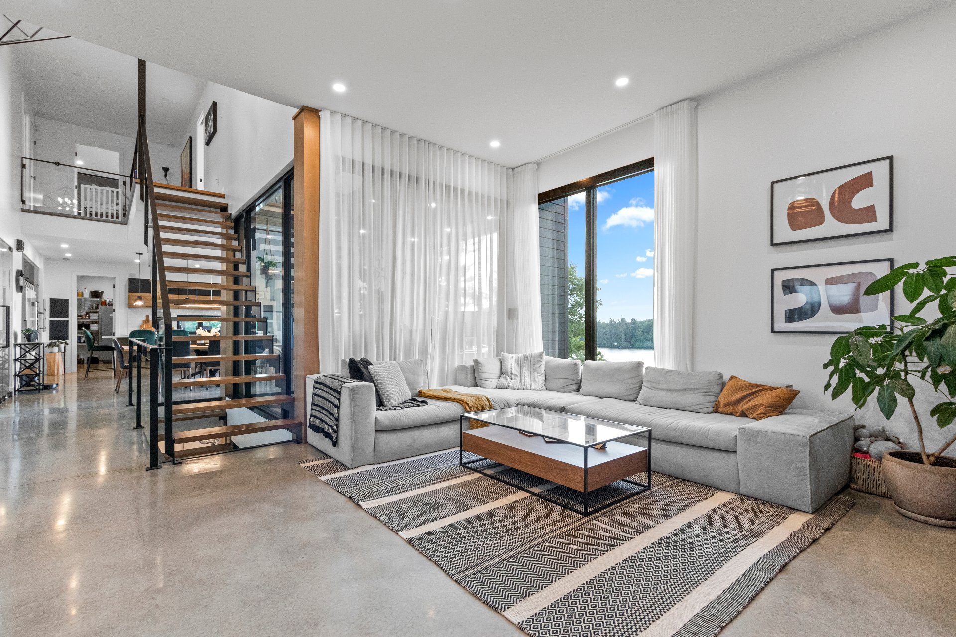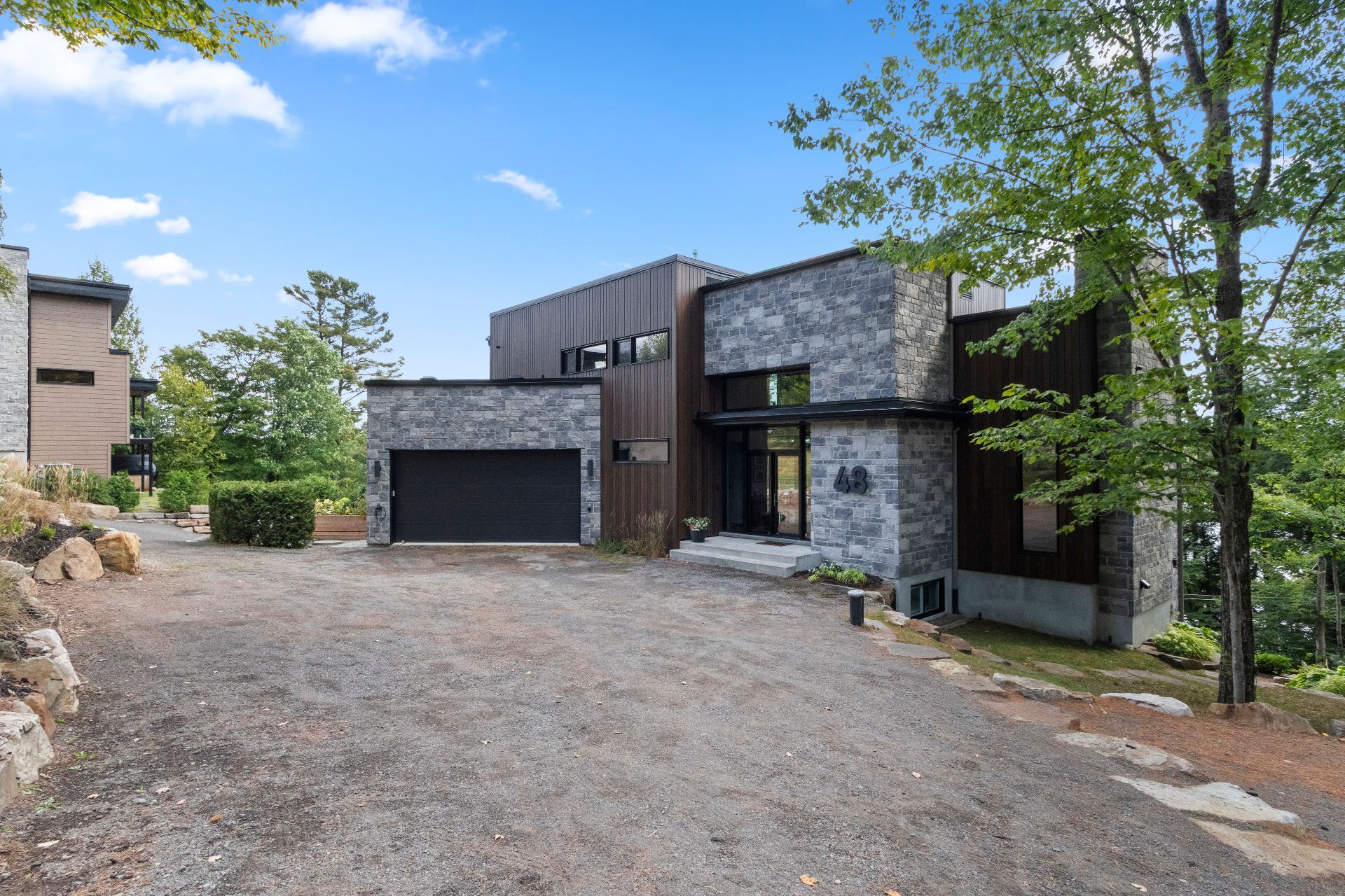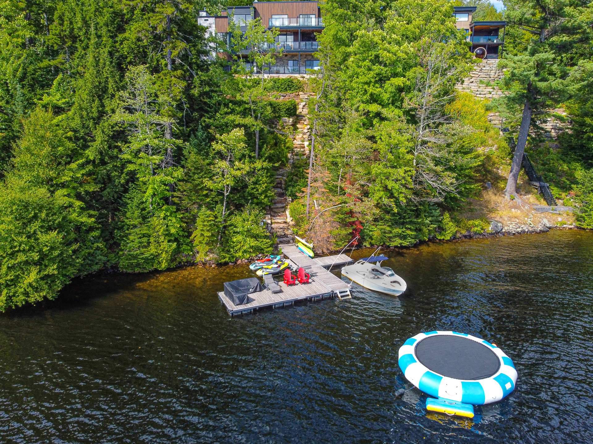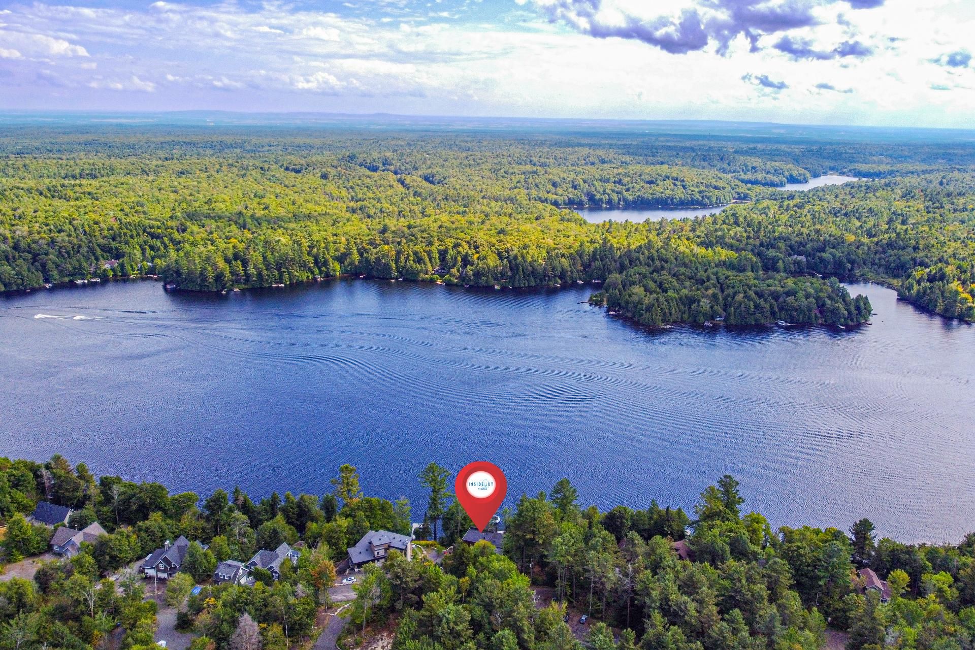 Exclusive custom-built property (2019) on Lake Barron. Offers spectacular views and easy access to the private dock. A contemporary, magazine-worthy home. The main floor is flooded with natural light, featuring 10-ft ceilings and heated concrete floors (glycol). Stunning kitchen with high-end appliances, quartz, and walk-in pantry. Spacious family room with Stuv wood fireplace; glass office (12×12) on two levels and a huge covered terrace. Garden-level basement includes 2 bedrooms, a dorm, gym, family room, and bathroom. Located 12 minutes from all services in Morin Heights.