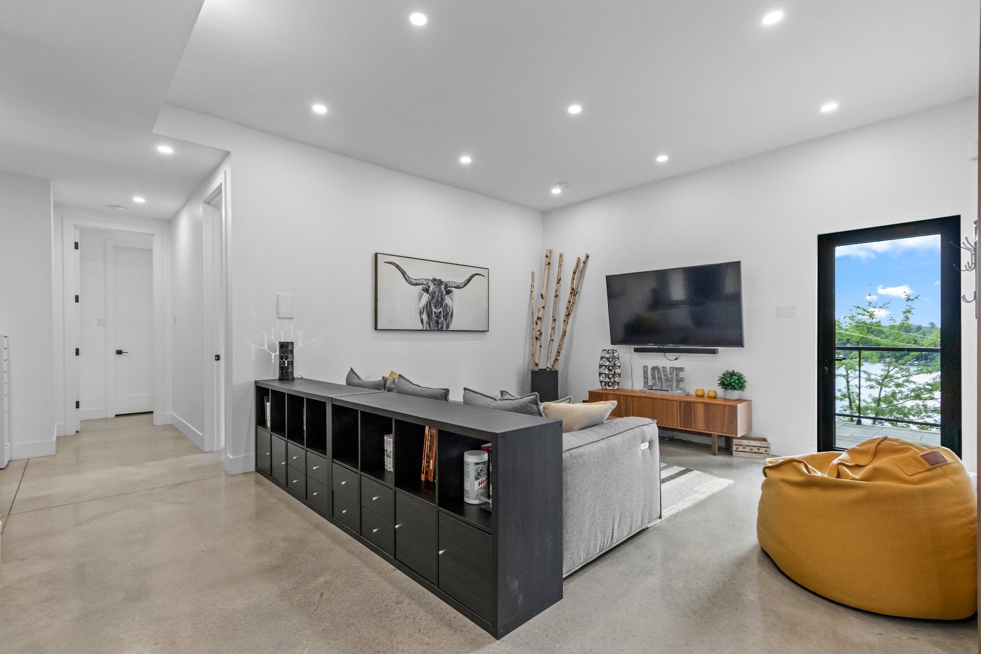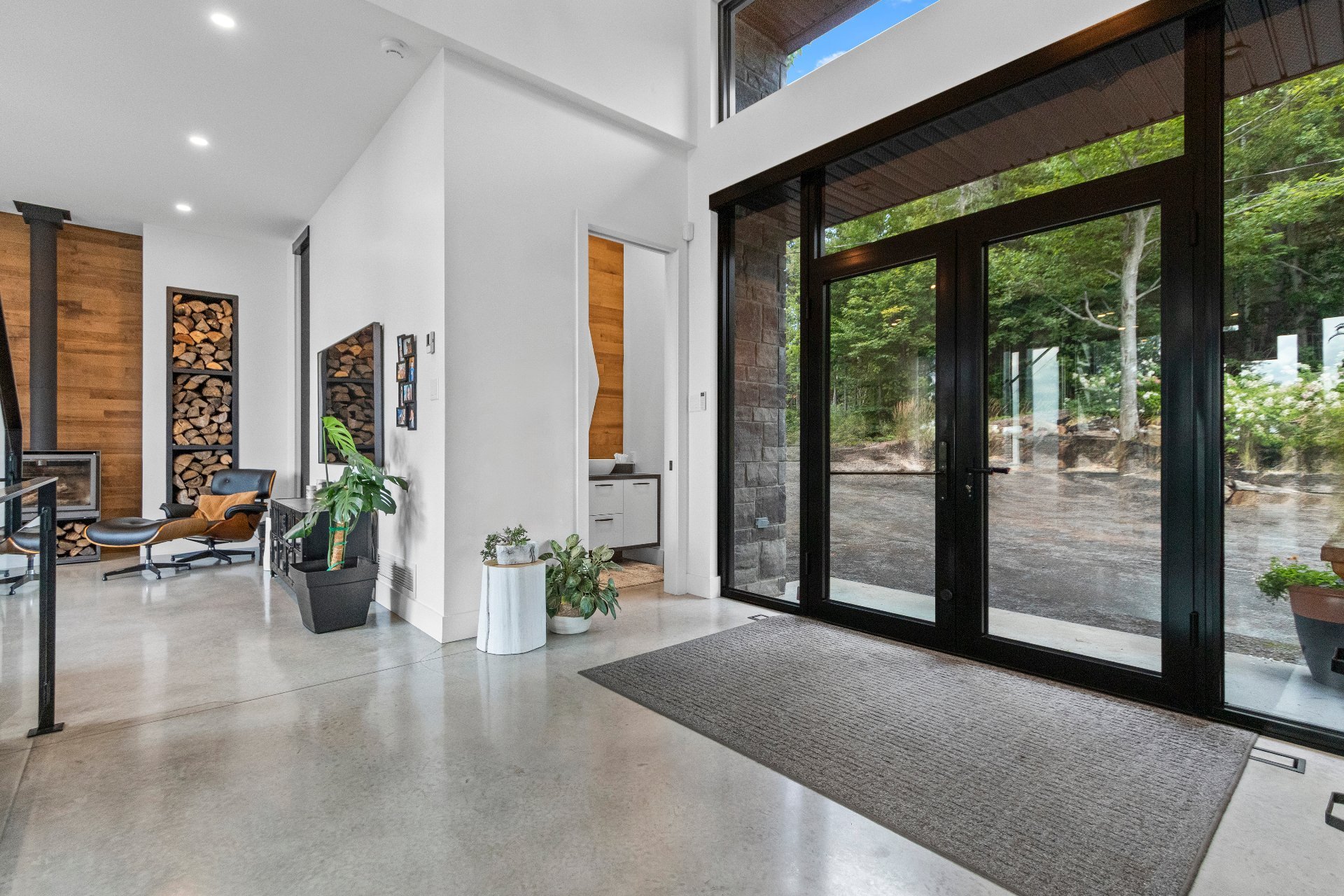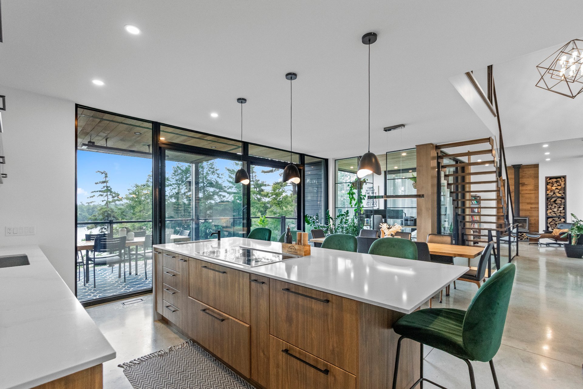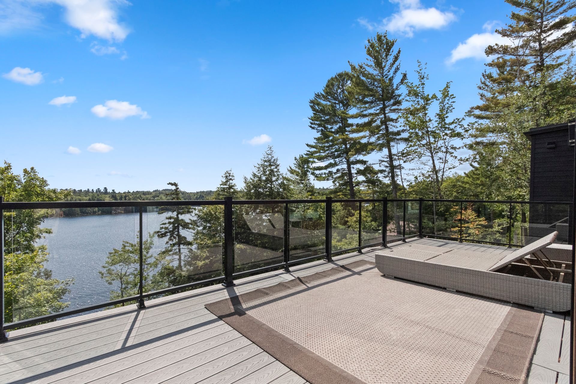 Exclusive custom-built property (2019) on Lake Barron. Offers spectacular views and easy access to the private dock. A contemporary, magazine-worthy home. The main floor is flooded with natural light, featuring 10-ft ceilings and heated concrete floors (glycol). Stunning kitchen with high-end appliances, quartz, and walk-in pantry. Spacious family room with Stuv wood fireplace; glass office (12×12) on two levels and a huge covered terrace. Garden-level basement includes 2 bedrooms, a dorm, gym, family room, and bathroom. Located 12 minutes from all services in Morin Heights.