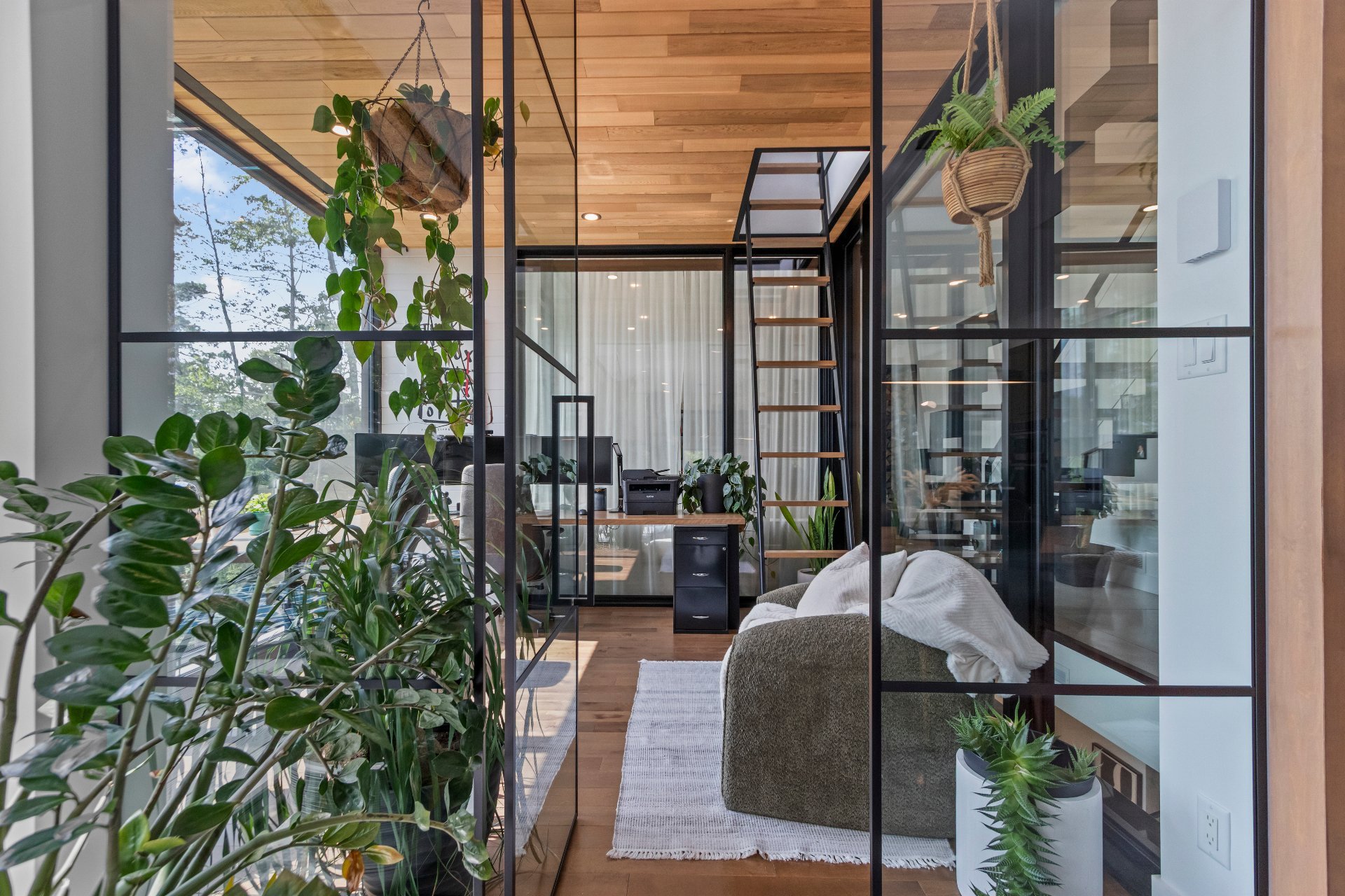 room, and a former garage converted into a gym with a glass