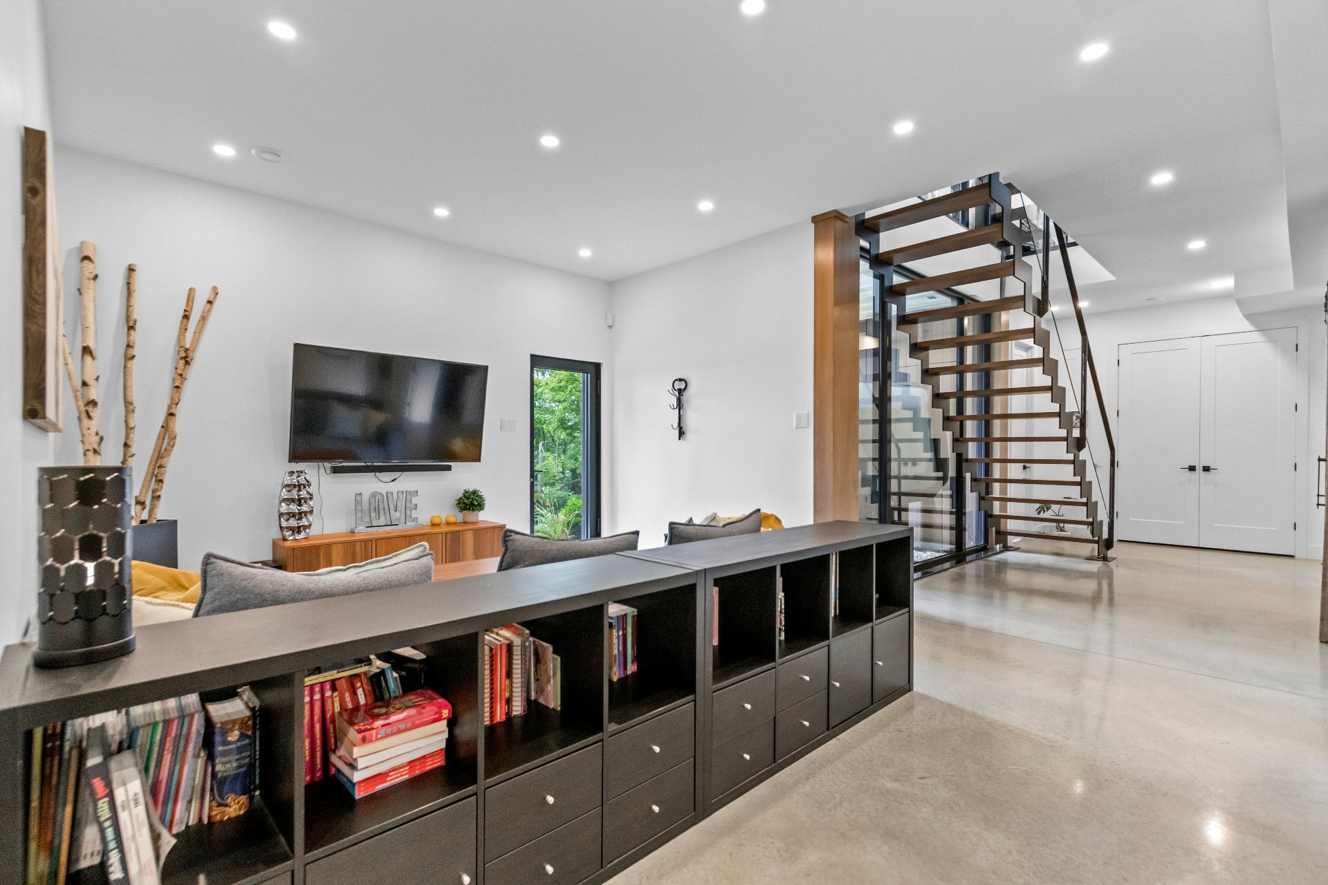 epoxy flooring and built-in wall storage. The basement slab